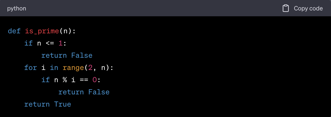 예를 들어, 사용자가 파이썬을 이용하여 특정 숫자가 소수인지를 판별하는 함수를 작성하고 싶다고 가정해봅시다. 이때 ChatGPT를 활용하면, 이 기능을 수행하는 코드를 작성할 수 있습니다. 사용자가 "파이썬으로 소수를 판별하는 함수를 어떻게 작성하나요?"라고 질문하면, ChatGPT는 다음과 같은 코드를 제안할 수 있습니다.